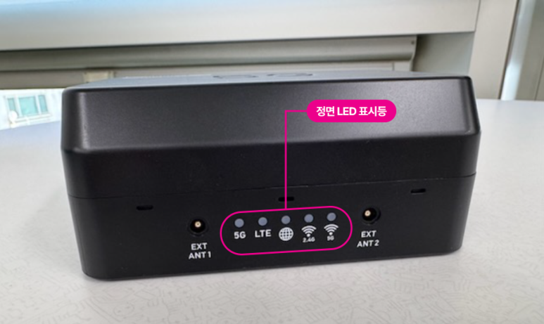 U+모바일인터넷 5G 라우터 전면에는 외부 안테나를 연결할 수 있는 EXT ANT 1,2와 5G 및 LTE 연결 상태, 인터넷 연결 상태, 와이파이 상태 등을 알려주는 LED 표시등을 찾을 수 있습니다. 외장 안테나를 별도 구매해 연결하면 인터넷 속도를 완화할 수 있습니다.
