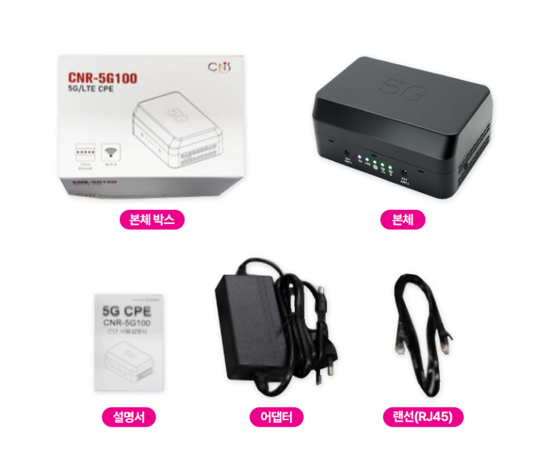 U+모바일인터넷 5G 라우터를 선택하면, CNR-5G150 본체와 함께 설명서, 어댑터, 랜선(RJ45)를 제공합니다.