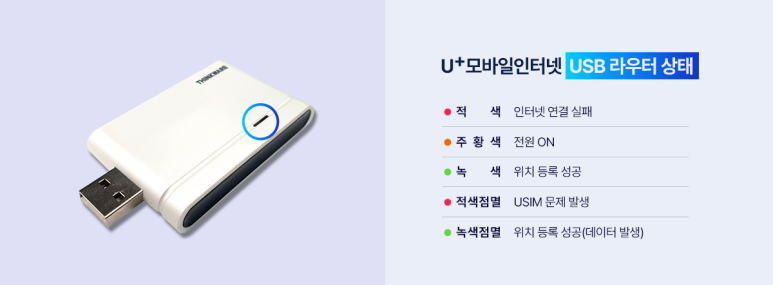 U+모바일인터넷 USB 라우터 상태 ???? 적색: 인터넷 연결 실패 ???? 주황색: 전원 ON ???? 녹색: 위치 등록 성공 ???? 적색 점멸: USIM 문제 발생 ???? 녹색 점멸: 위치 등록 성공(데이터 발생) |